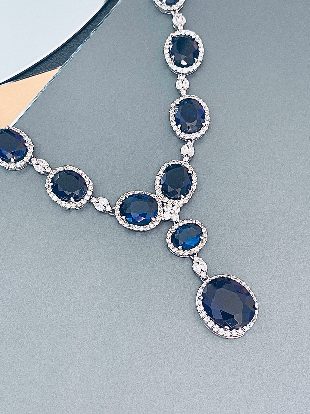 VIRGINIA - 16.5" Sapphire Blue Oval CZ Necklace And Matching Drop Earrings In Silver